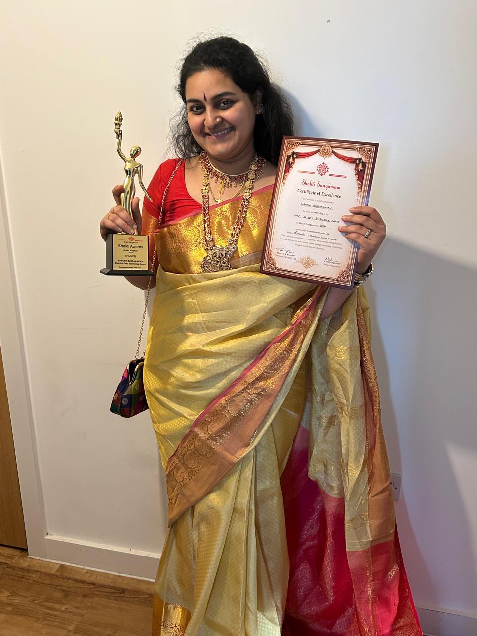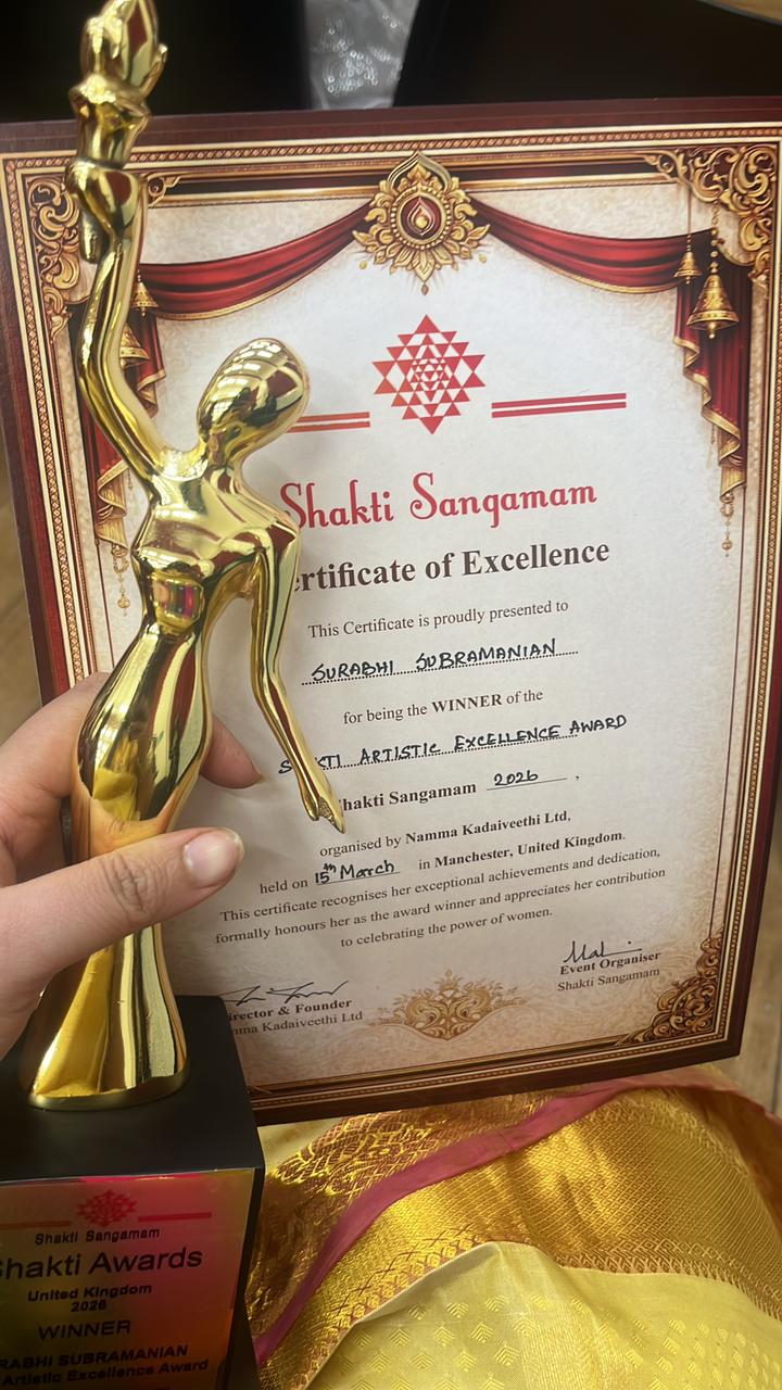 We are incredibly proud to share that our founder and lead educator, Surabhi Subramanian, has been awarded the prestigious Shakti Artistic Excellence Award 2026 at the Shakti Sangamam ceremony — organised by Namma Kadaiveethi Ltd in Manchester, United Kingdom.